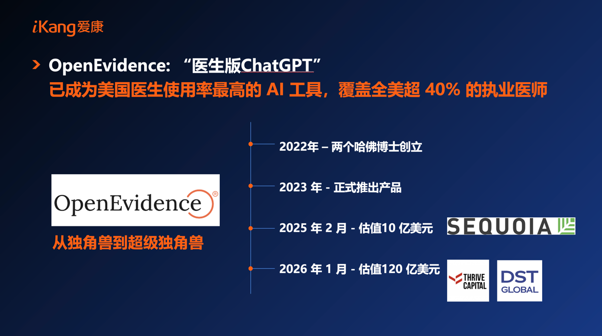 正如过去一年里迅猛发展的OpenEvidence,它作为“医生版的ChatGPT”,是美国医生最为关注的人工智能公司,其估值在一年内从10亿美金跃升到120亿美金。以往医生制定治疗方案,多依赖经验或查阅最新研究,但如今医学期刊更新极快,医生难以全面掌握最新进展。OpenEvidence可实时追踪全球权威医学期刊、指南及临床案例,为医生提供精准疾病治疗方案并附文献出处,在解决医疗资源稀缺、提供精准方案方面创造巨大价值。