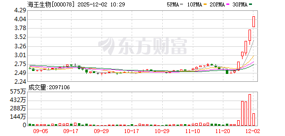 海王生物盘中涨停,已连收5个涨停板,截至9:35,该股报4.11元,换手率7.40%,成交量1.94亿股,成交金额7.79亿元,涨停板封单金额为3.08亿元。连续涨停期间,该股累计上涨61.18%,累计换手率为62.58%。最新A股总市值达108.14亿元,A股流通市值107.95亿元。