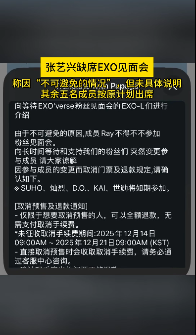12月14日下午,张艺兴发文回应:“我因参加国家话剧院重要活动而于上午赶回北京,目前我已安全抵达北京,请大家放心。在此,为我的缺席向粉丝、队友、公司及每一位受到影响的人致以深深的歉意。”