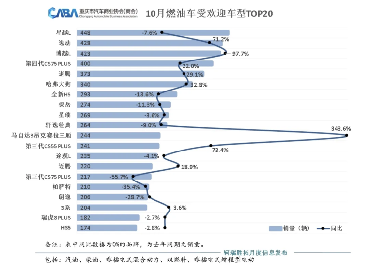 反观燃油车市场,10月,重庆燃油车销量占比为35.6%。在10月份燃油车的销量TOP20中,自主与合资车型数量占比基本还是势均力敌,各占五成。但前三名均被自主品牌车型占据,分别是星越L(448辆)、逸动(428辆)、博越L(423辆)。